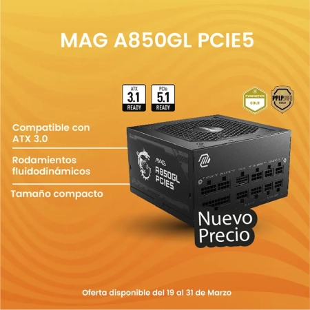 Precio Regular Q1,147.00MSI, MAG A850GL PCIE5, Fuente de alimentación – 824142319222
