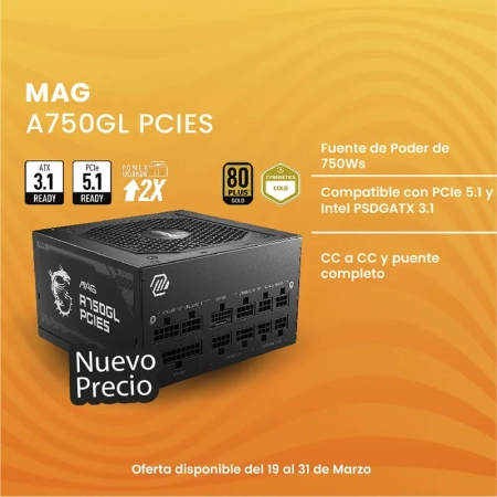 Precio Regular Q956.00MSI, MAG A750GL PCIES, Fuente De Poder De 750Ws (80 Plus Gold) – 824142319239
