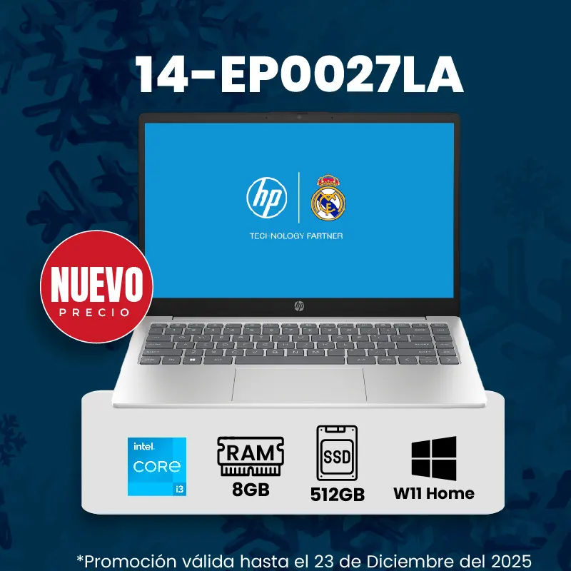 | Nombre Recomendado | Laptop HP 14-ep0027la, Intel Core i3, 8 GB RAM, 512 GB SSD, 14, HD Windows 11 Home |
